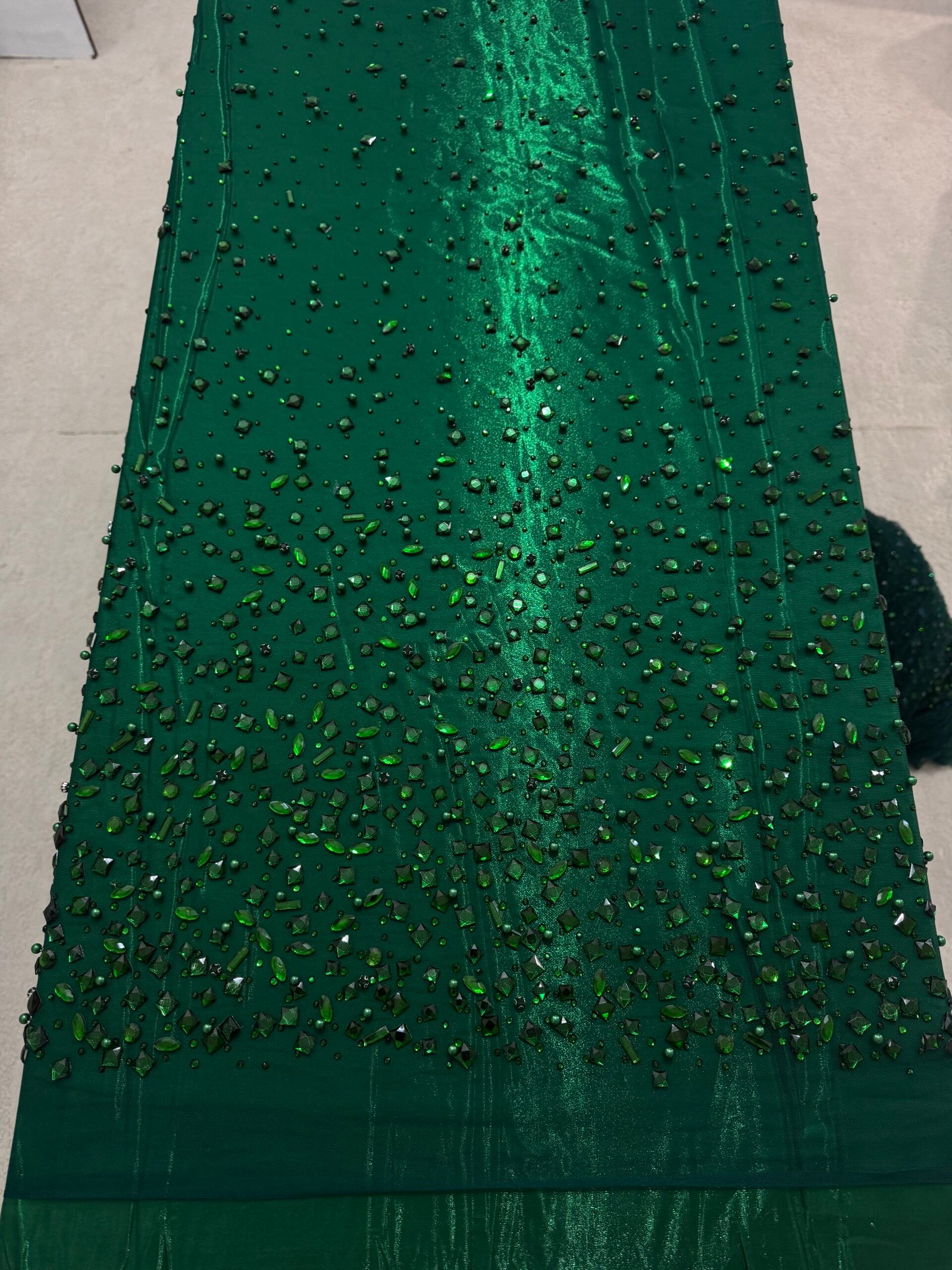 Son vert émeraude profond évoque la noblesse et la richesse, tandis que les paillettes et perles cousues à la main captent la lumière avec raffinement, pour un rendu à la fois luxueux et sophistiqué.