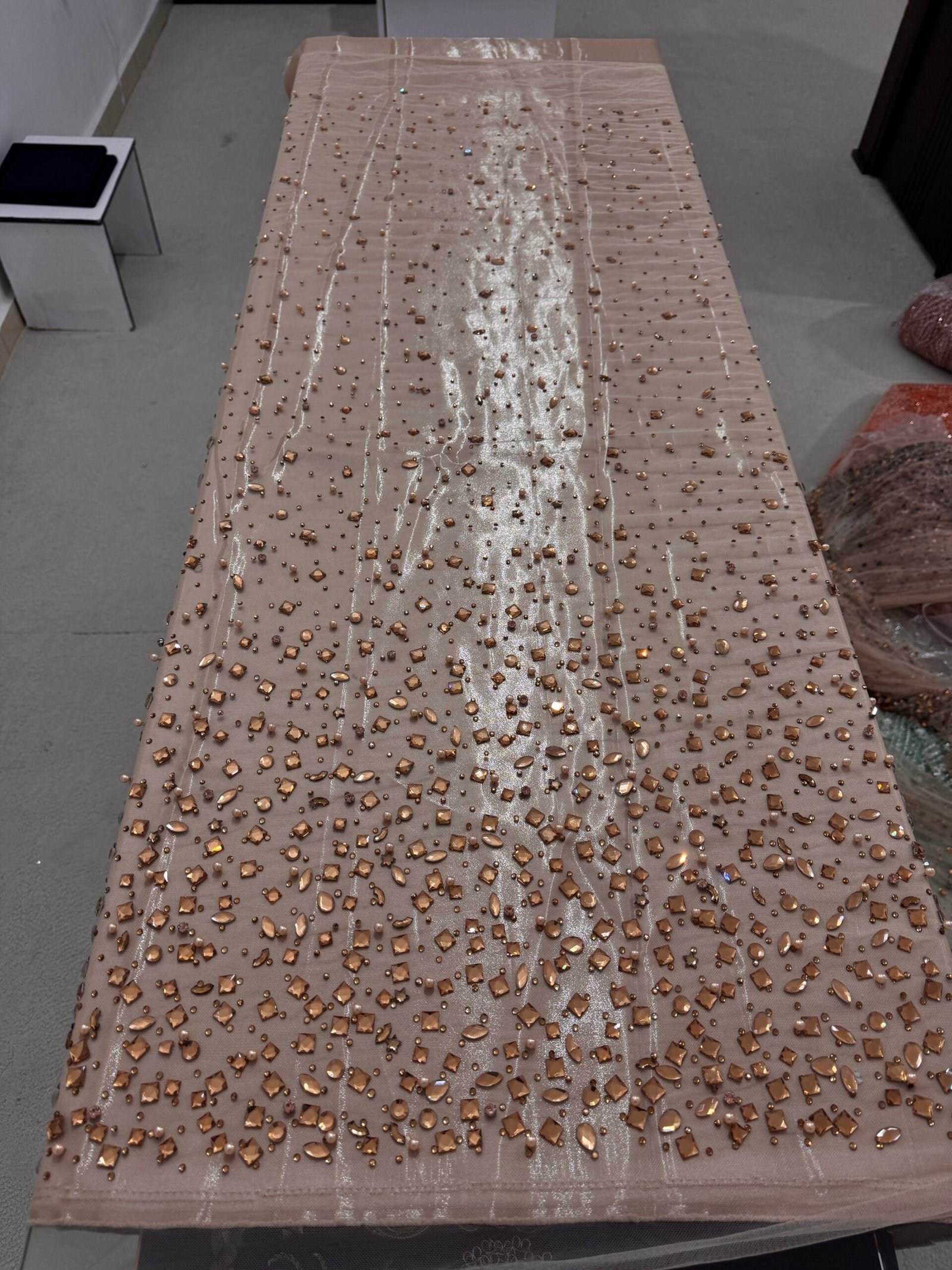 Réalisée sur une base de tulle français haut de gamme, cette dentelle offre un motif dégradé : des lignes verticales de sequins sur la partie supérieure et une finition dense de perles scintillantes sur le bas, créant un effet de relief somptueux.