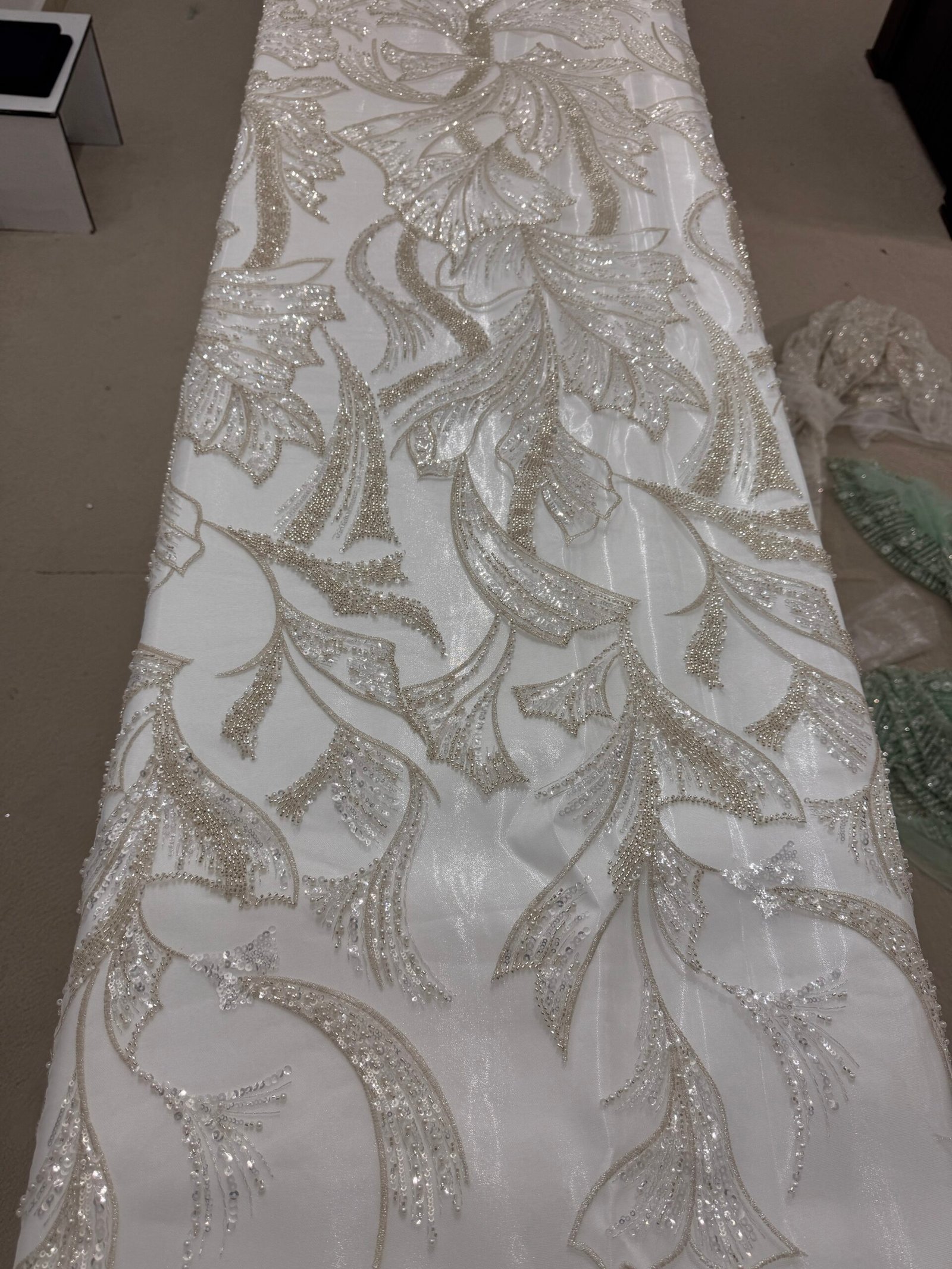 Chaque lace est soigneusement brodée de perles et de paillettes cousues à la main, offrant un éclat raffiné et une texture luxueuse sur une base de tulle doux et fluide.