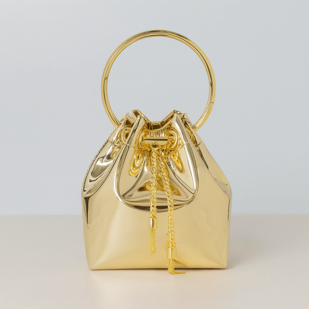 Sa silhouette en seau rigide doré, d’une brillance miroir, est sublimée par une anse circulaire façon bracelet et un cordon coulissant en chaîne dorée terminé par un pompon élégant.