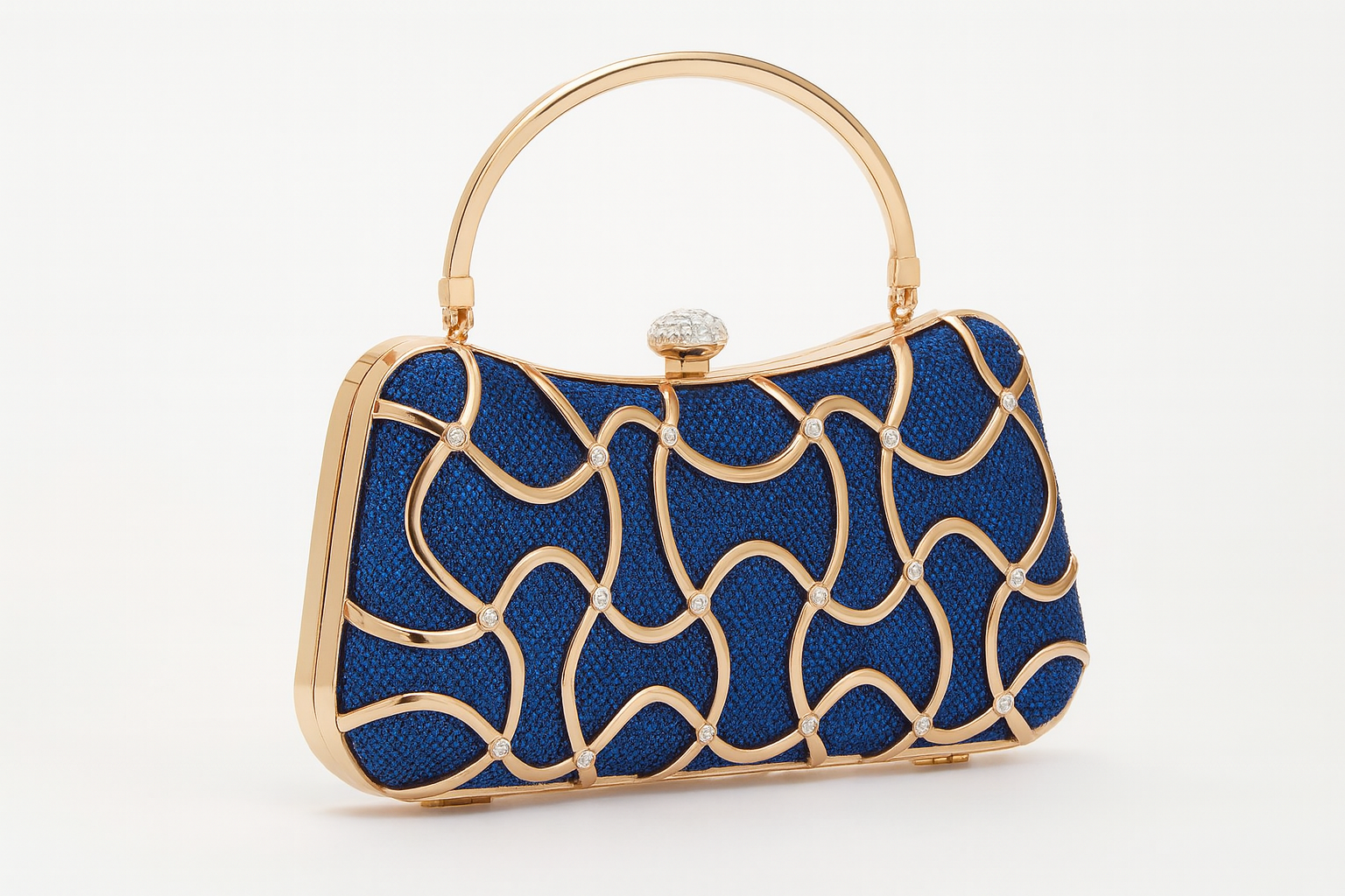 Son corps bleu royal scintillant est rehaussé d’un maillage doré aux courbes fluides, souligné par des cristaux lumineux.