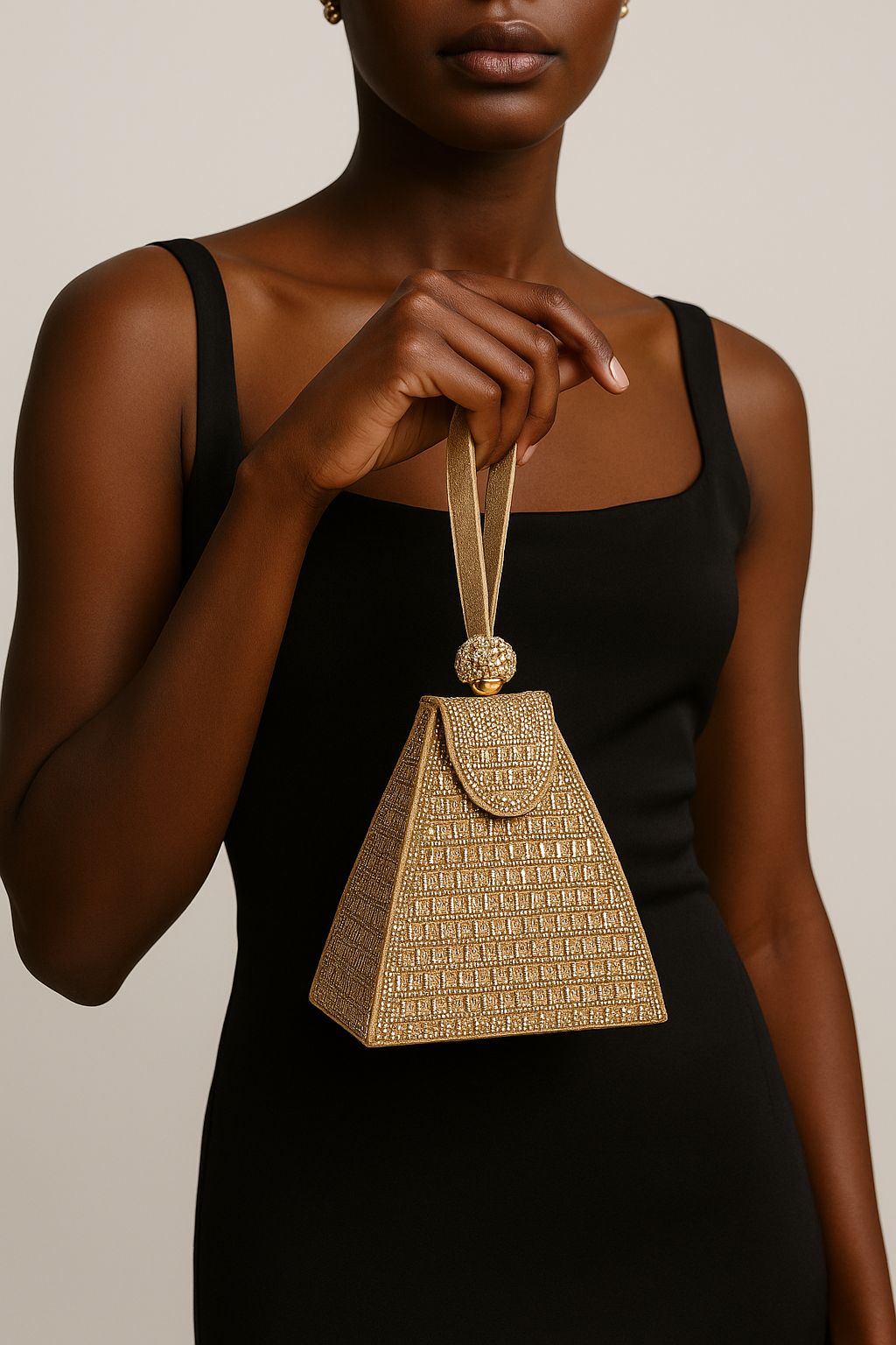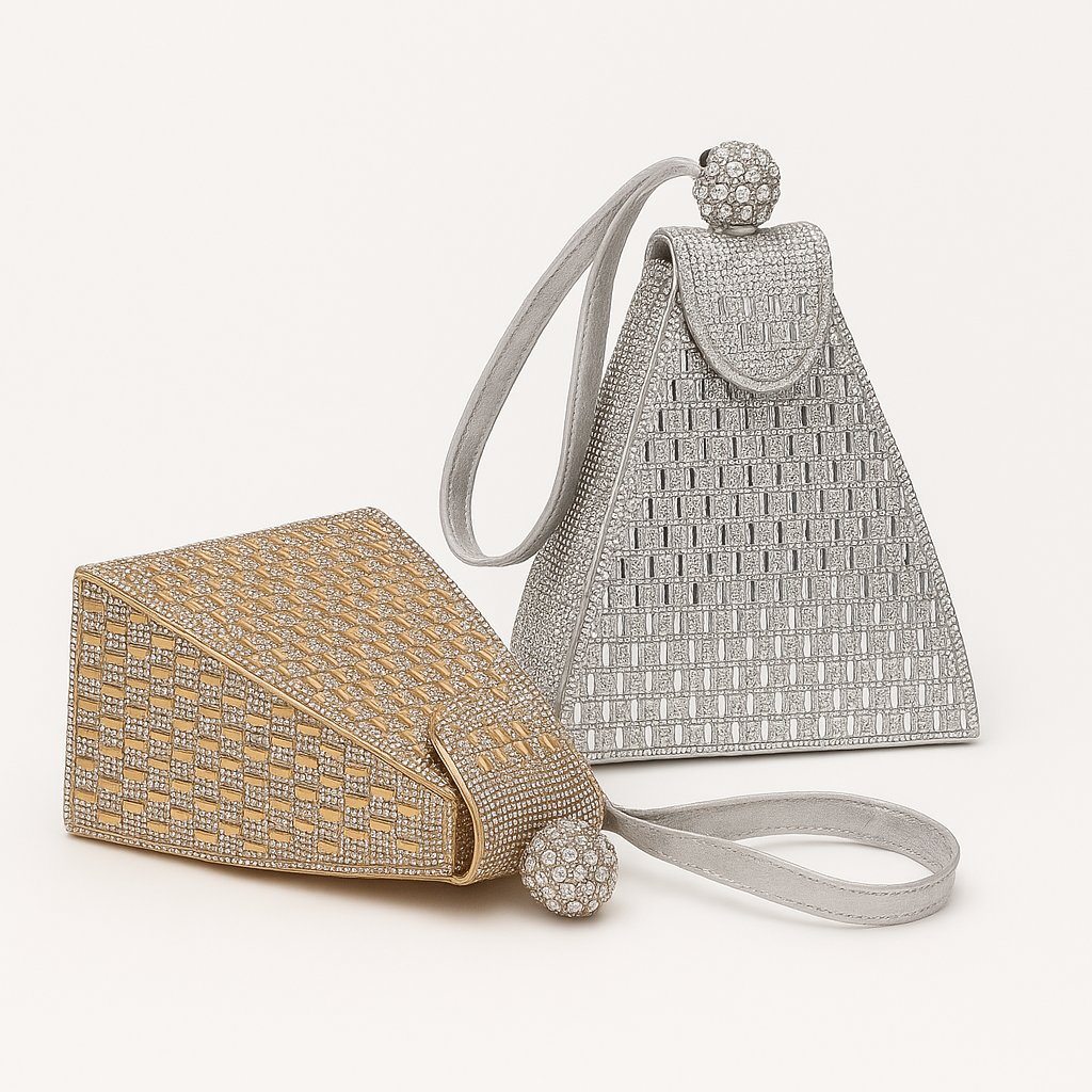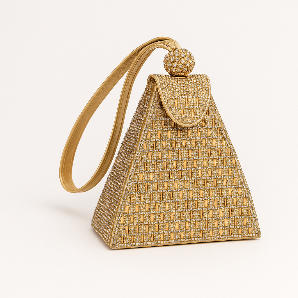 Conçu dans une structure pyramidale rigide, il se distingue par son revêtement entièrement incrusté de strass dorés et argentés, formant un motif géométrique élégant.