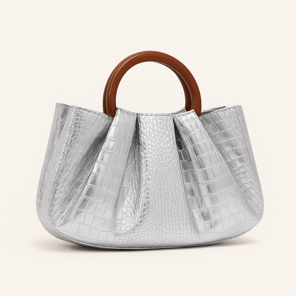 Le sac Elodie est une pochette sculpturale en cuir doré effet croco, conçue pour capturer la lumière avec élégance.