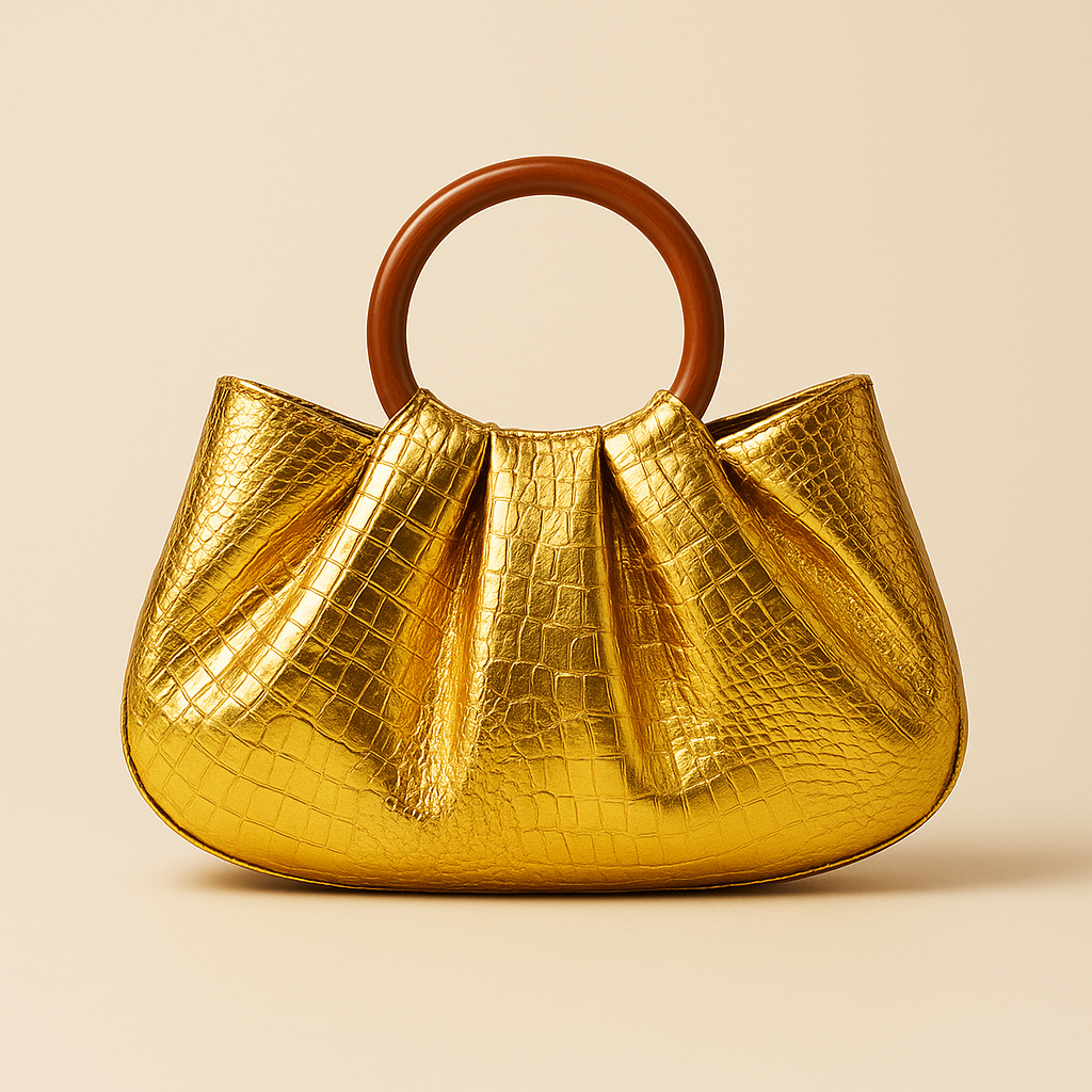 Sa teinte or chaude et profonde lui confère un éclat luxueux sans ostentation, tandis que sa forme plissée structurée apporte du volume et du caractère.