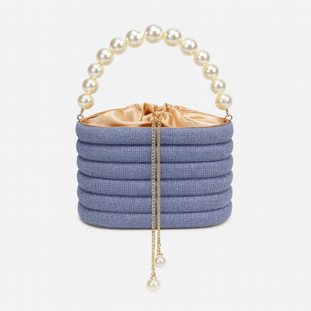 L’intérieur est orné d’une pochette satinée couleur champagne, resserrée par un lien doré pour un maintien délicat. Le sac se distingue par sa anse composée de grosses perles nacrées, symbole de féminité et de grâce, ainsi qu’une chaîne dorée fine ornée de perles pour un porté main ou épaule.